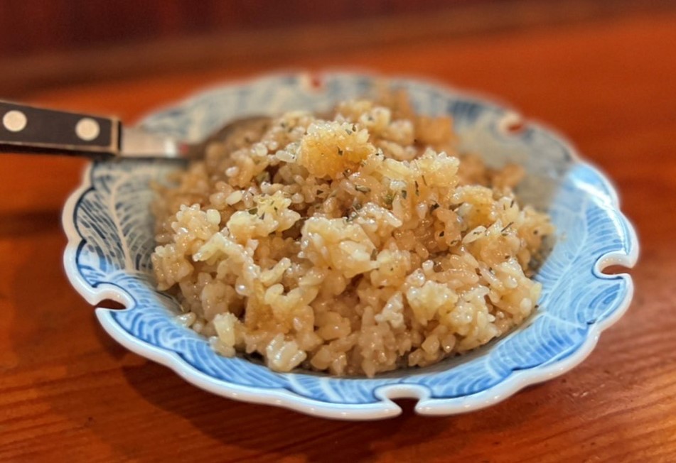 ちなみに、おつまみの中では「鉄板ダイニング鉄○」でも提供していた「もち明太チーズ」が特に人気。大久保さんは「牛すじカレーや炊き込んで作るガーリックライス(写真下)もオススメです。ぜひ、ステーキと共に食べていただきたい自慢の逸品です」と話します。