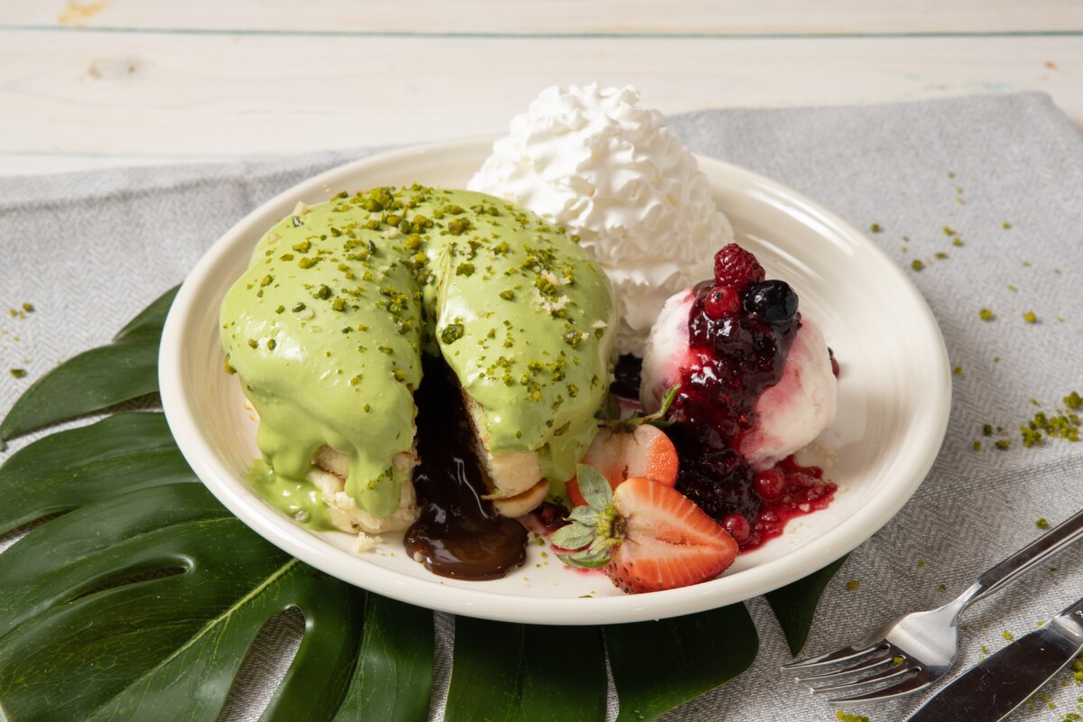 パンケーキを切ると中からガナッシュがとろけだす「ピスタチオ&フォンダンショコラパンケーキ」