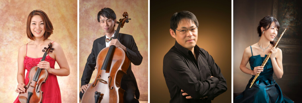 「響ホール室内合奏団」プロデュースによるヴァイオリン、チェロ、ピアノ、フルートの奏でるハーモニーを楽しめます。演奏者は加来洋子さん(ヴァイオリン)、中村充さん(チェロ)、山根浩志さん(ピアノ)、籾山仁美さん(フルート)。