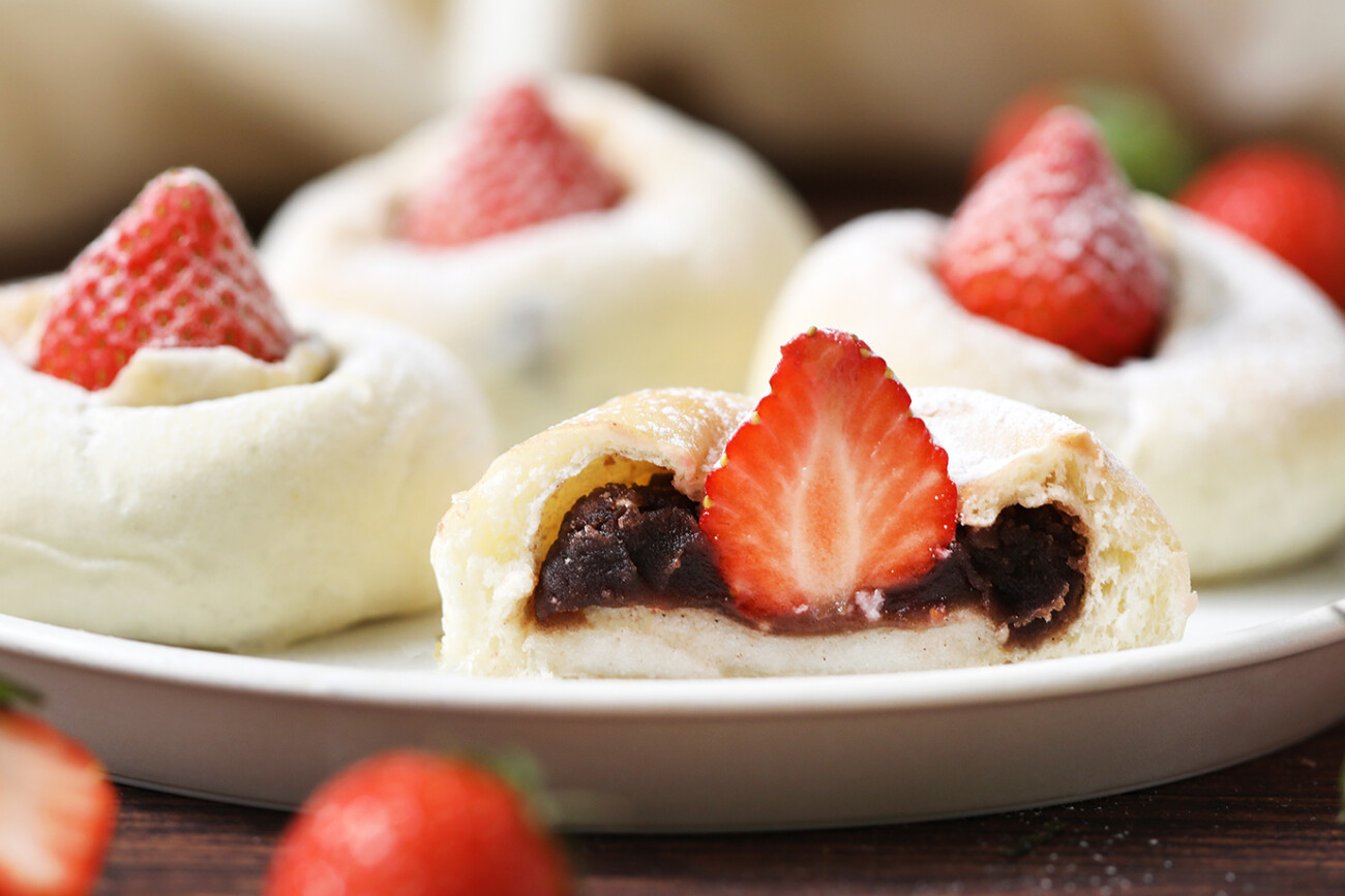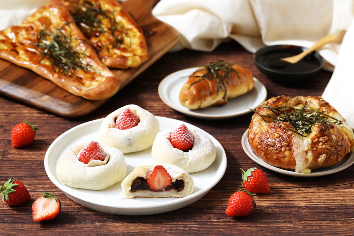 白いパン生地にお餅とこしあんを入れて包んで焼き上げ、最後にいちごをトッピング。甘い香りとコロンとしたフォルムに心弾む一品です。