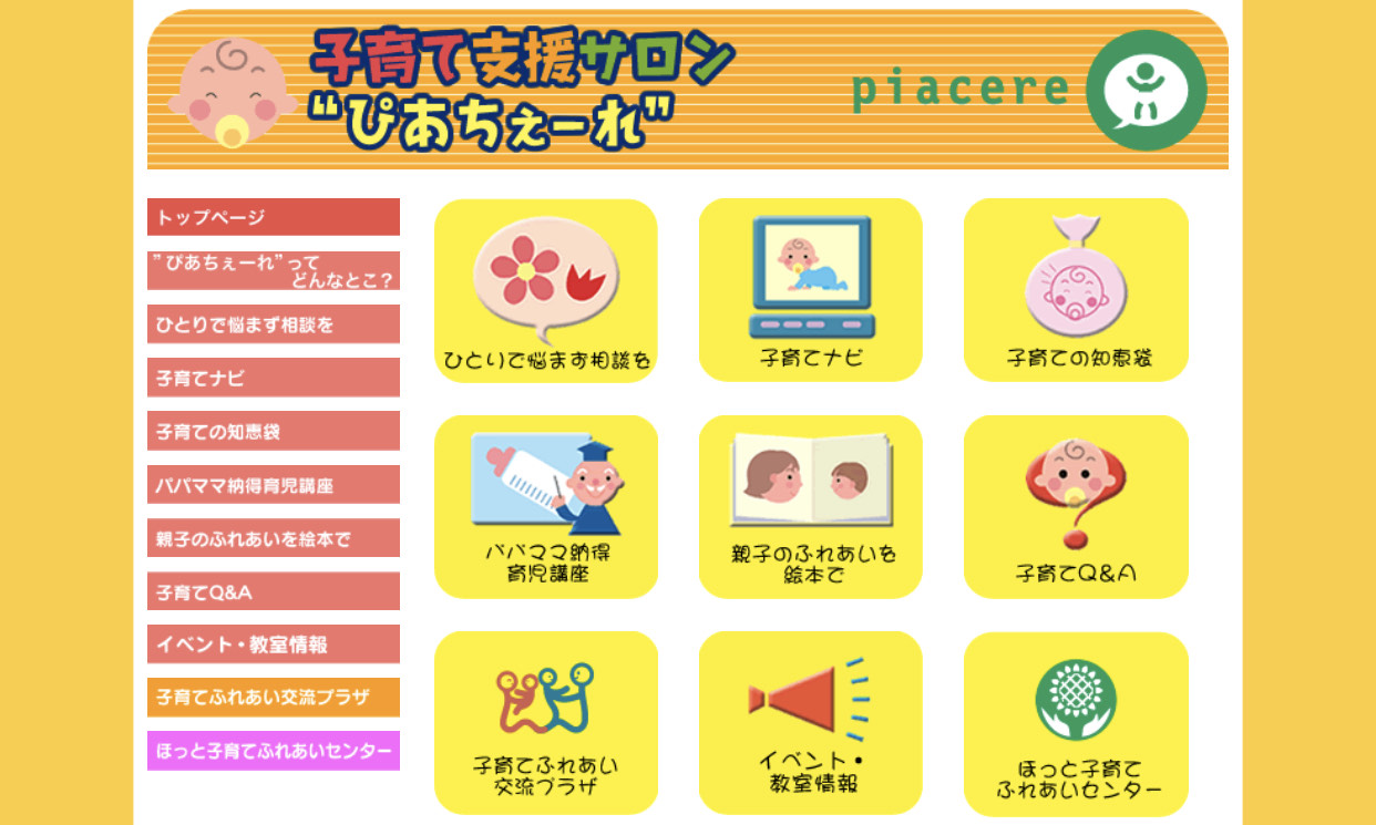 まずは子育て支援サロン”ぴあちぇーれ”のことを知ってください。保育士、看護師の資格を持ったスタッフが、一緒に考えて子育てのお手伝いをしてくれます。