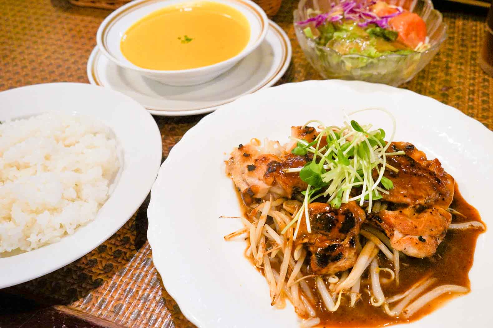 そんなことを考えている間に料理が完成。目の前に運ばれてきました。メインはしっかり洋食メニューなのですが、箸が提供されるのが「れりっしゅ」の「日替わり定食」のおもしろいところでもあります。チキンソテーのソースはご飯との相性も抜群で箸が進みます。パンプキンスープもやさしい味で、おかわりをお願いしたくなるほどでした。