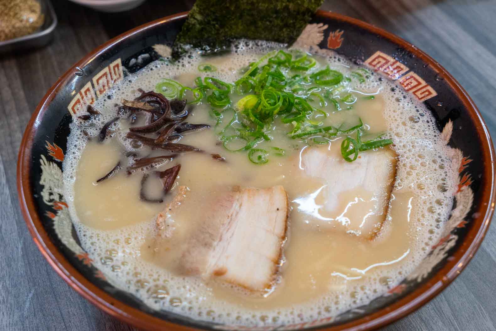同店のラーメンは、泡ぶく系豚骨スープは濃厚でありながら臭みはなく、柔らかい飲み口。麺は細麺で、麺の硬さは選択制ではなくお任せです。チャーシューは丁度いい脂ののり具合で外側はカリッと焼き目がついていて美味。全体のバランスがとてもいいラーメンです。
