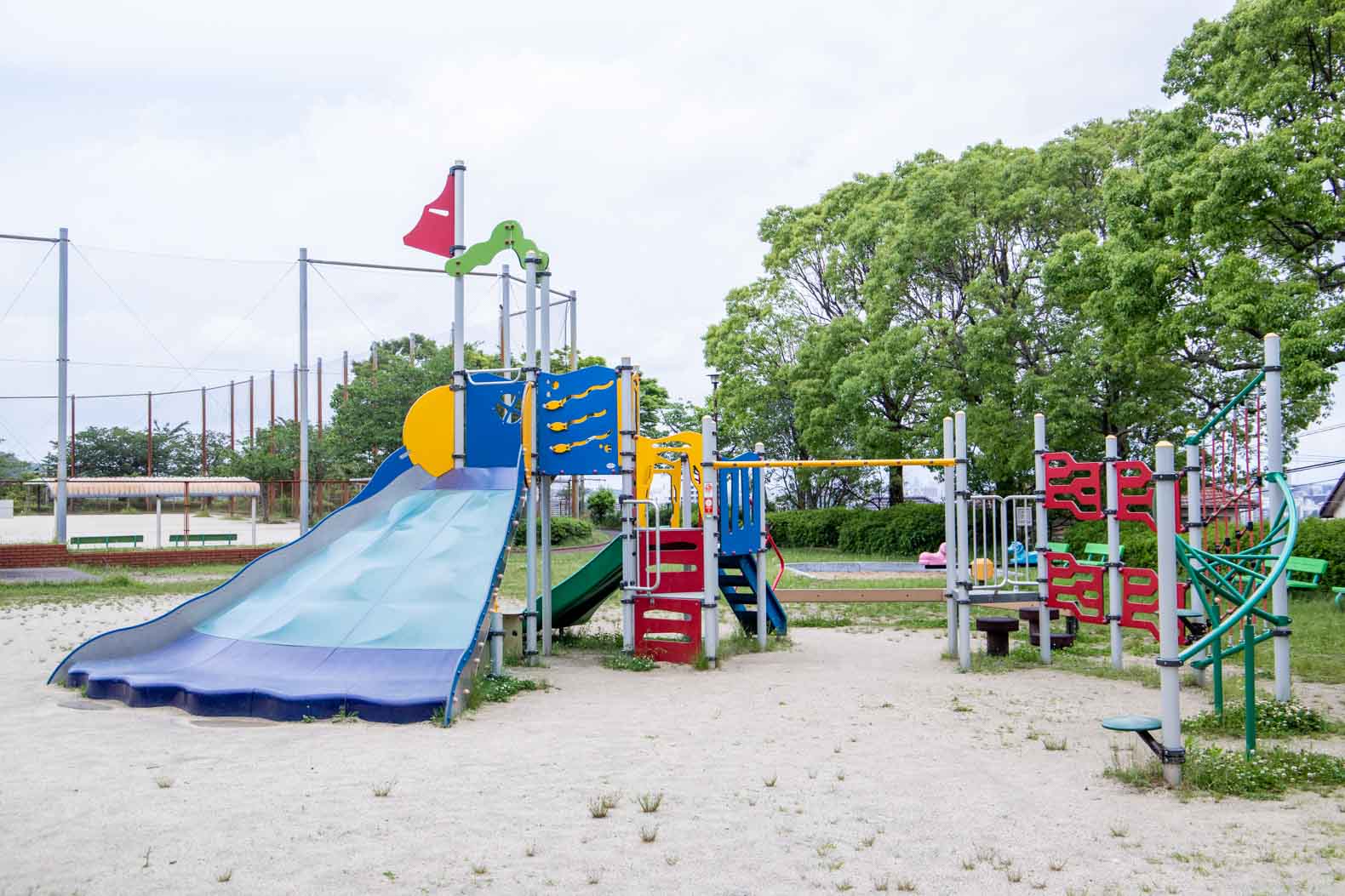 公園内にはアスレチックが設置されていますが、クジラのしっぽのような形をした波打つすべり台が一際目を引きます。「海」をモチーフとした遊具のようですが、公園名には「山」がついていて、高台に位置しているにも関わらず、遊具が「海」。なんとも不思議な印象を受ける公園でした。