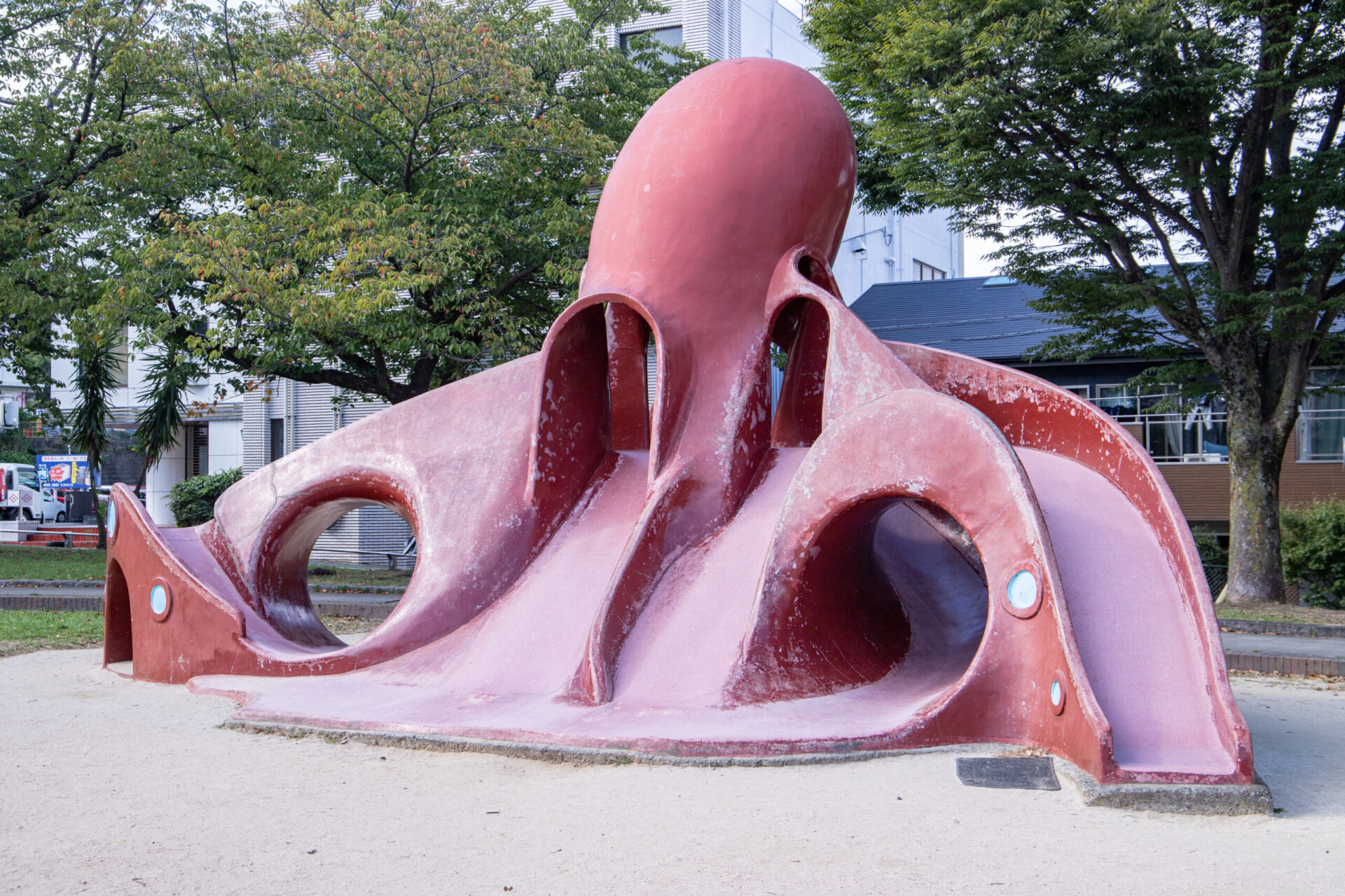 北九州市内にはタコすべり台が11基あり、そのほとんどがピンク色なのですが、大池公園のタコすべり台は珍しい赤色。これまでいくつかのタコすべり台を取材してきましたが、真っ赤なものは初めて。まるで“ゆでダコ”のようです。また、公園の端の方には「なぜここに?」と尋ねたくなるようなゾウの親子のオブジェもありました。