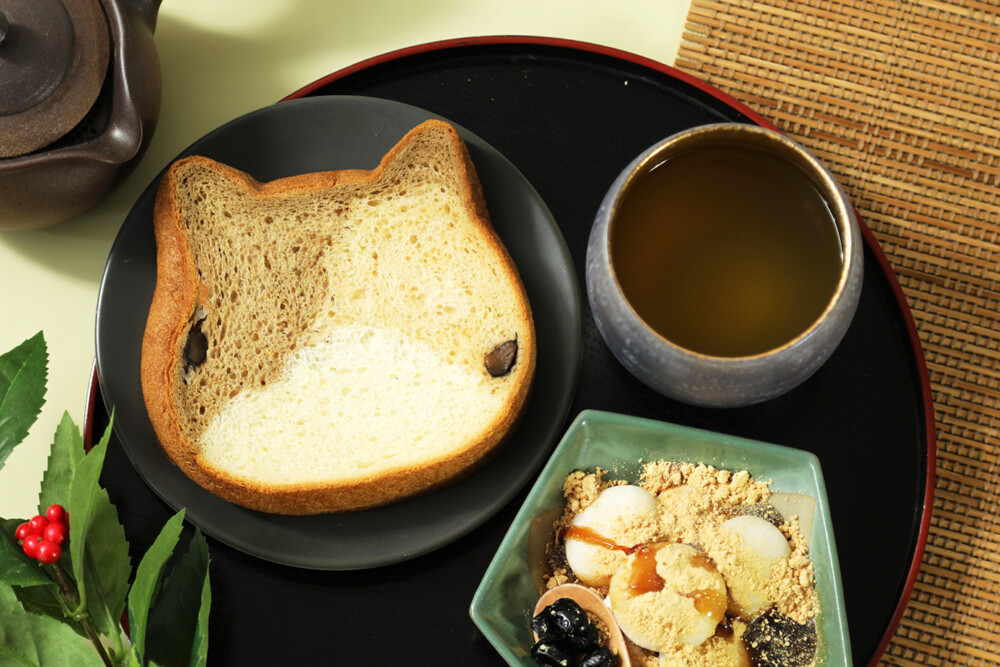 「ねこねこ食パン きなこもち」は、「ねこねこ食パン」で人気の「三毛猫」が季節限定でお正月バージョンとして登場するもの。黒豆を混ぜたきなこ風味の生地、お餅を混ぜた黒糖風味の生地、プレーン生地の3種類の味わいを一度に味わうことができます。