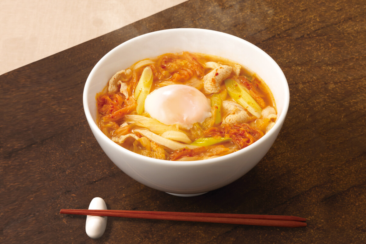 店舗でとった優しい味わいの出汁と温泉卵のまろやかさがキムチの辛さを引き立てる、ピリ辛うどんです。