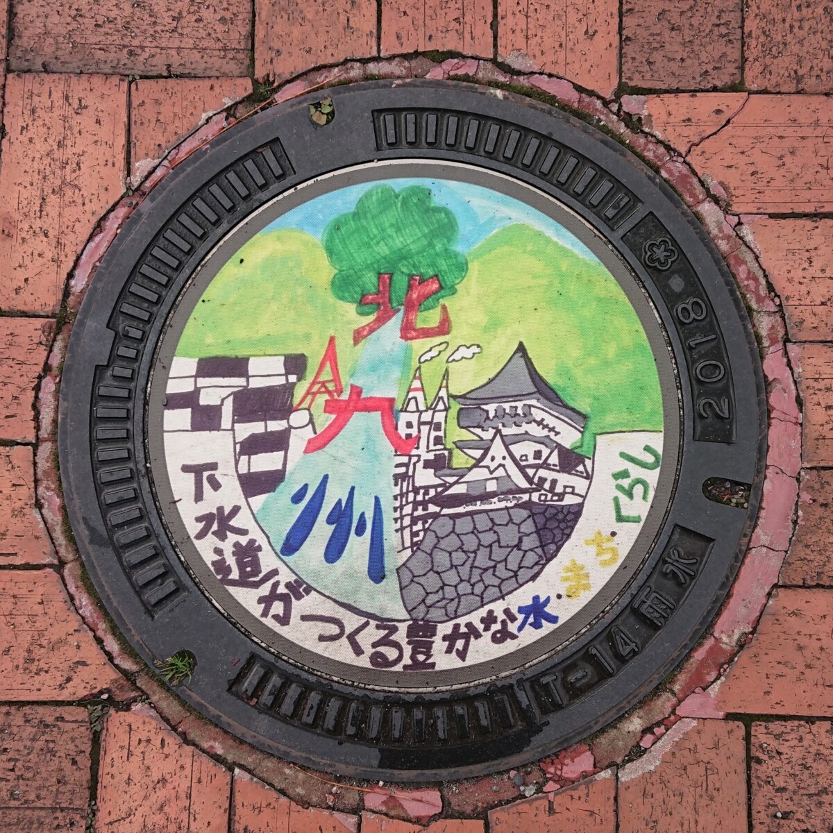 北九州市下水道100周年を記念して、2018年に小学4年生を対象として行われた「下水道ポスターコンテスト」。その優秀作品がデザインマンホール蓋となって、各区に1つずつ設置されています。