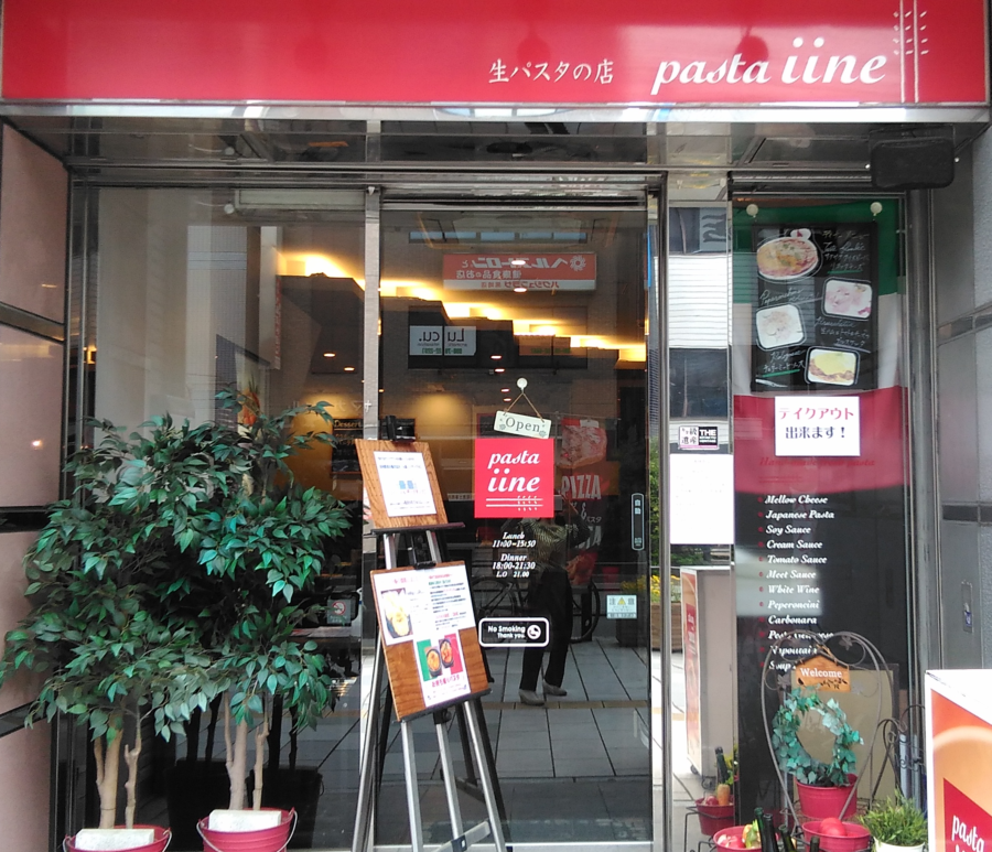 黒崎駅から「ふれあい通り」を歩いて5分ほどで右手に赤い看板の「生パスタの店 pasta iine(イイネ)」があります。市内では希少な生パスタの専門店です。