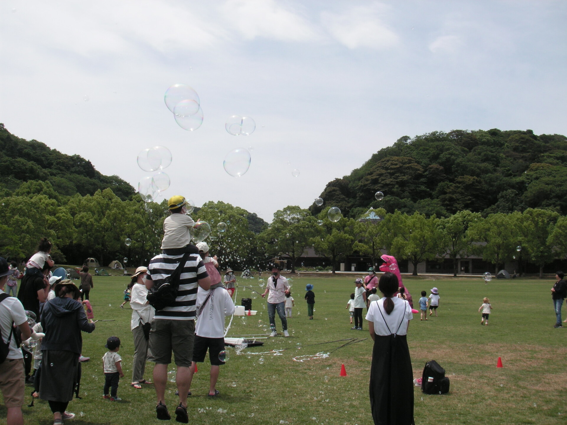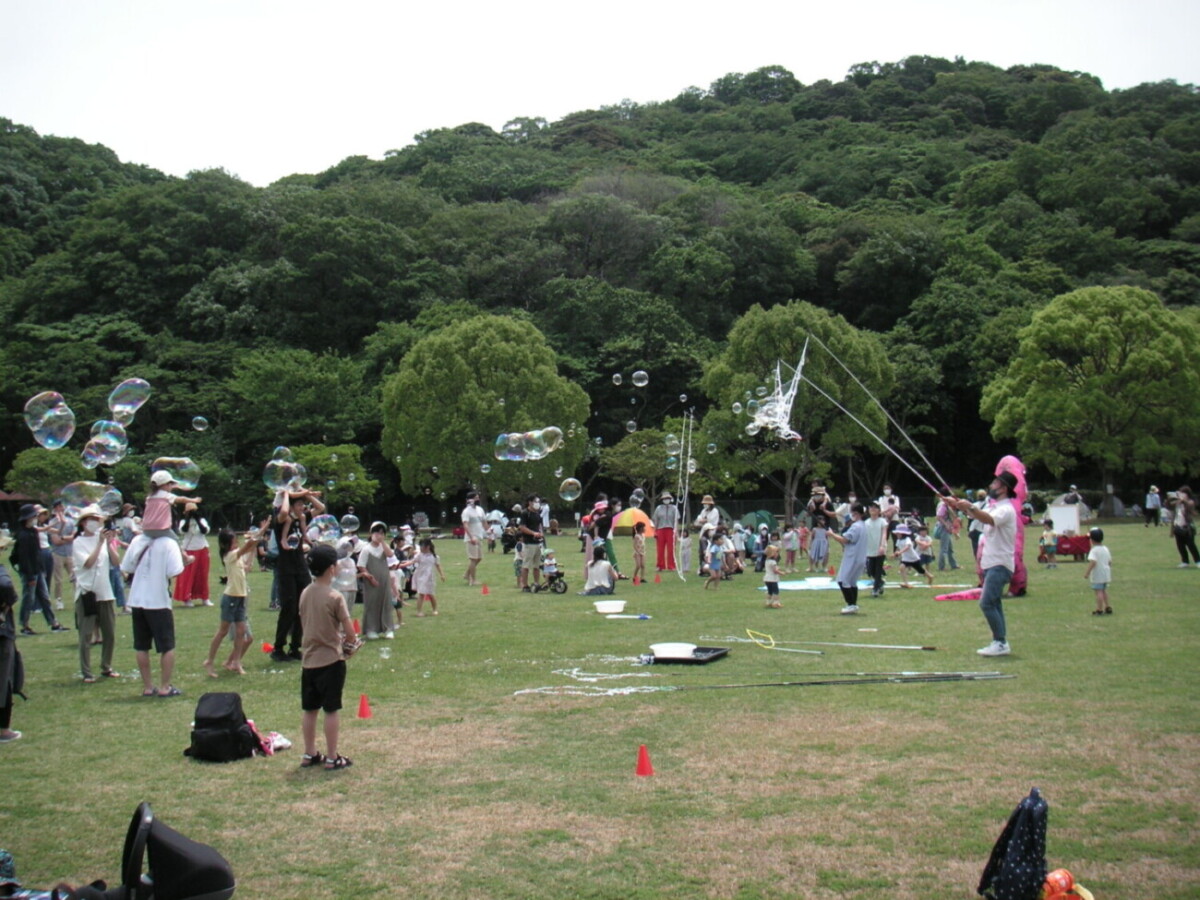 大きなシャボン玉などたくさんのシャボン玉が、山田緑地の芝生広場に飛びまくります。予約不要で、誰でも参加可能。参加費は無料です。