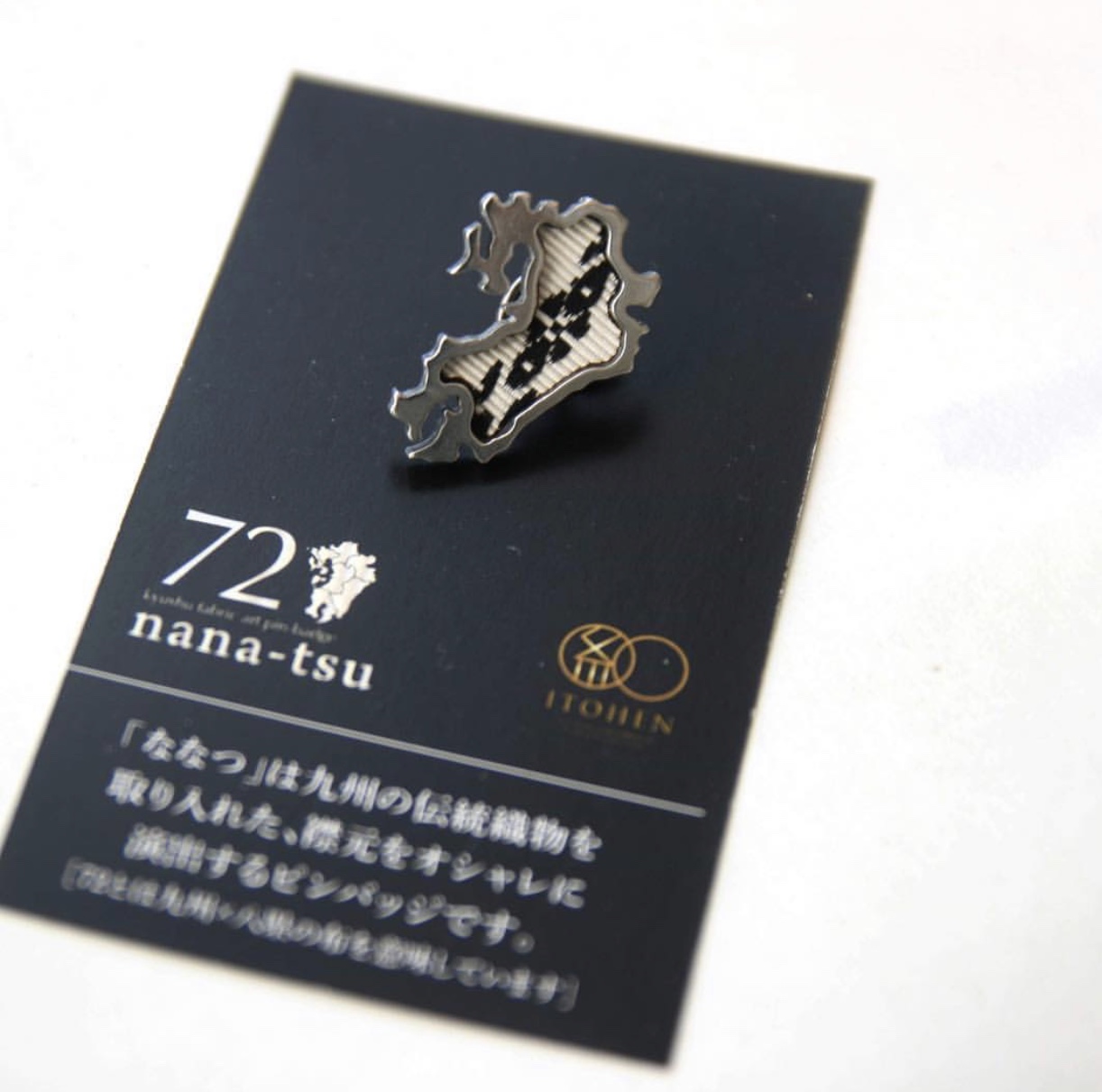 「伝統織物を新しい形にアップデートし、過去と未来、人と人を繋ぐ作品を制作したい」との想いで、「小倉織」をはじめ、九州・沖縄のさまざまな伝統織物を用いた製品を開発し、発表している「ITOHEN」(戸畑区)。中でも、九州各県の伝統染織物を九州型のピンバッジの中に織り込めた「九州伝統織物ピンバッジ 72(nana-tsu)」が好評です。