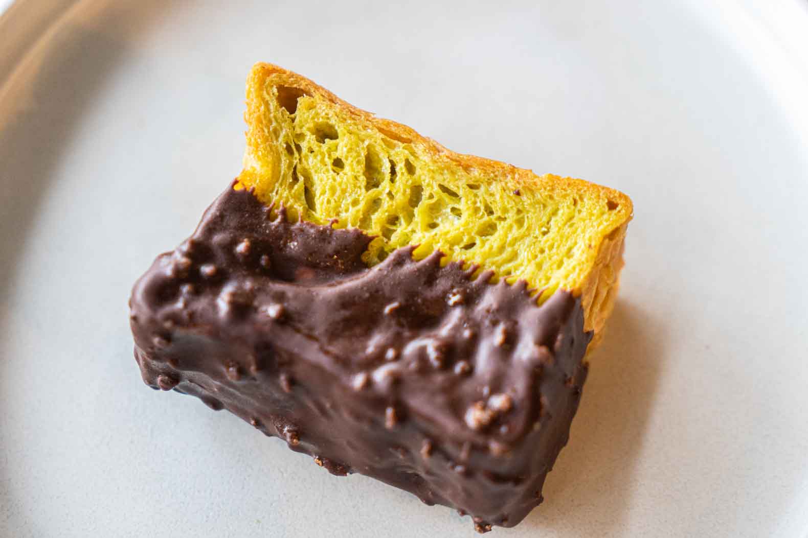 フレーバーは、レギュラーメニュー10種に加え、期間限定フレーバー1~2種類を用意。初めての人にはカスタードプリンのような味わいの『バニラ』がお店のオススメだそう。また、女性人気ナンバーワンは『ピスタチオ』(写真下)。ほんのり甘みのある生地でチョコがよく合う一品です。
