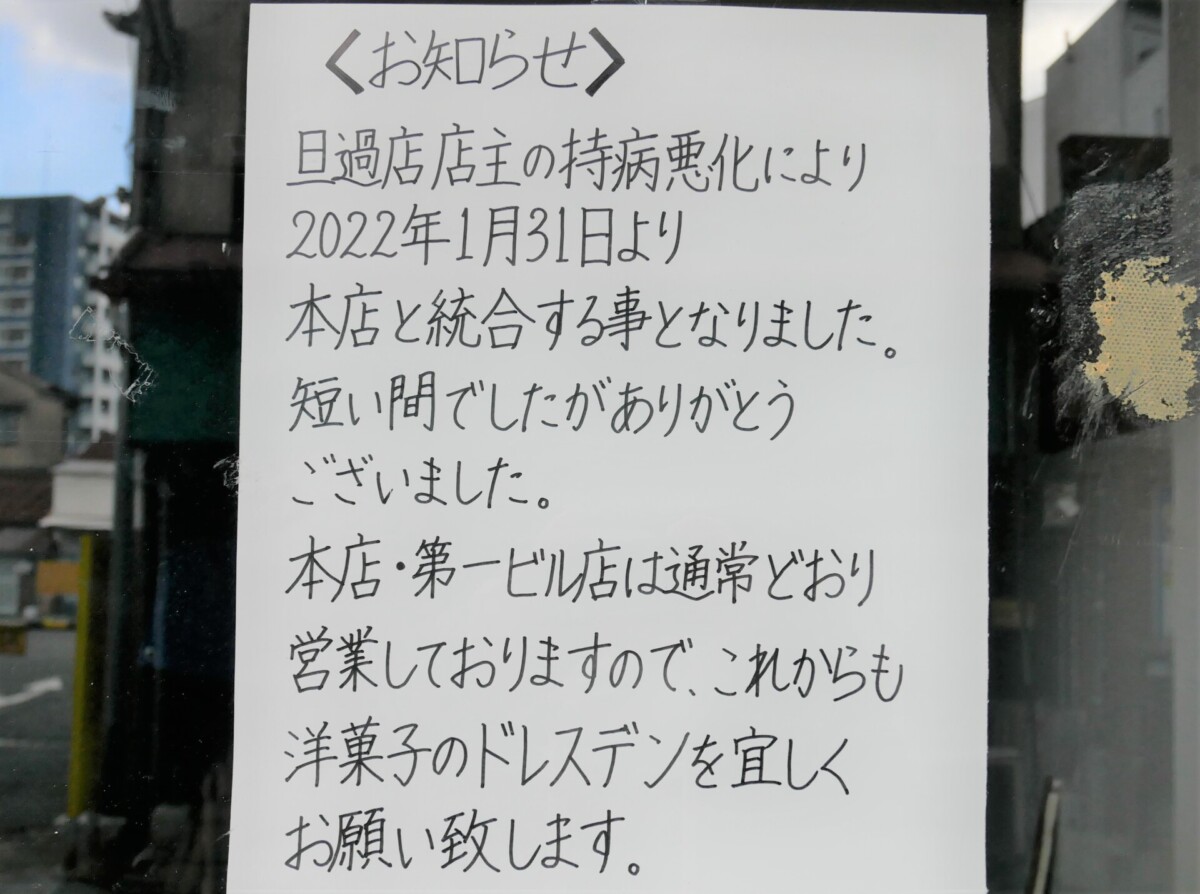 昨年4月にオープンした老舗洋菓子店「ドレスデン」の旦過店が1月末に閉店しました。