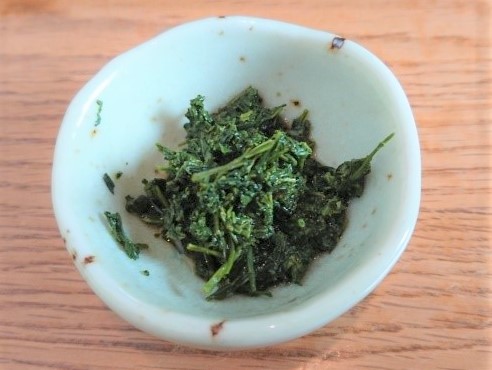 家では新鮮茶葉を使うのはもったいなく感じてしまい、お茶を入れた後すぐの茶葉を再利用(新鮮さが命)。茶葉に含まれた水分を一旦絞り、ポン酢をかけて…。『SDGs』で素敵な一品ができましたよ。