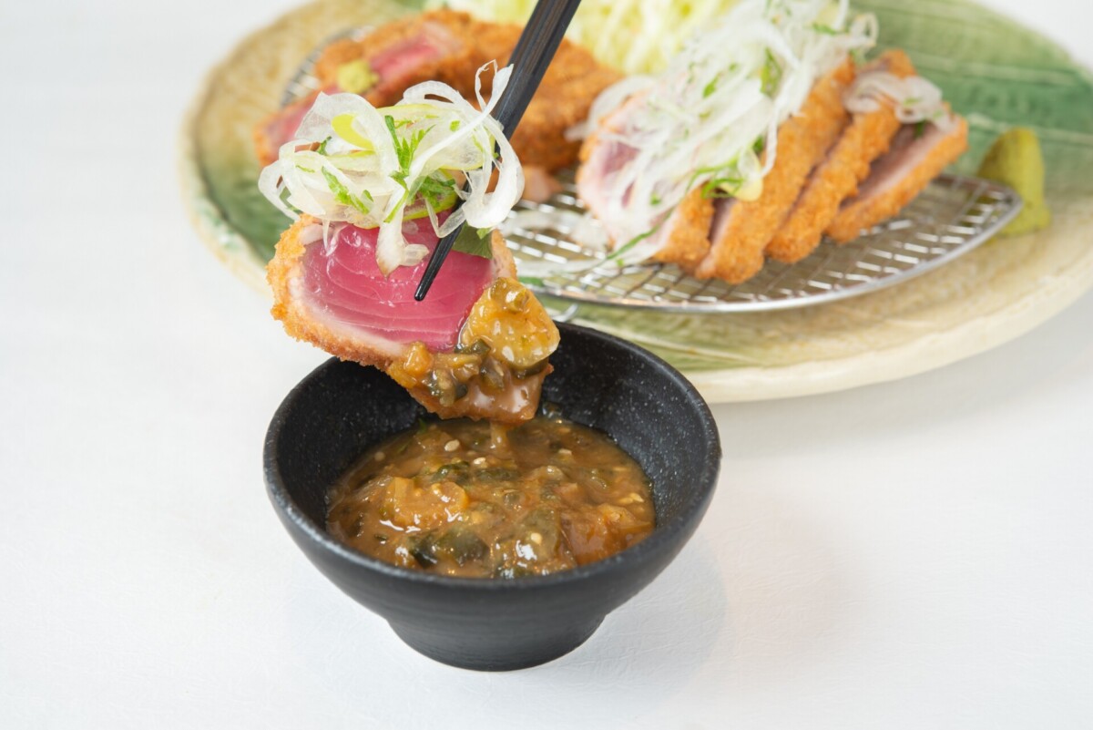 鰹のうま味を引き立てる特製の「ピリ辛にんにく味噌」と4種の薬味(大葉・タマネギ・長ネギ・三つ葉)を合わせたり、定番の「だし醤油・山椒塩・牛カツソース」と合わせたり、豊富な薬味とつけだれで、さまざまな組み合わせを楽しむことができます。
