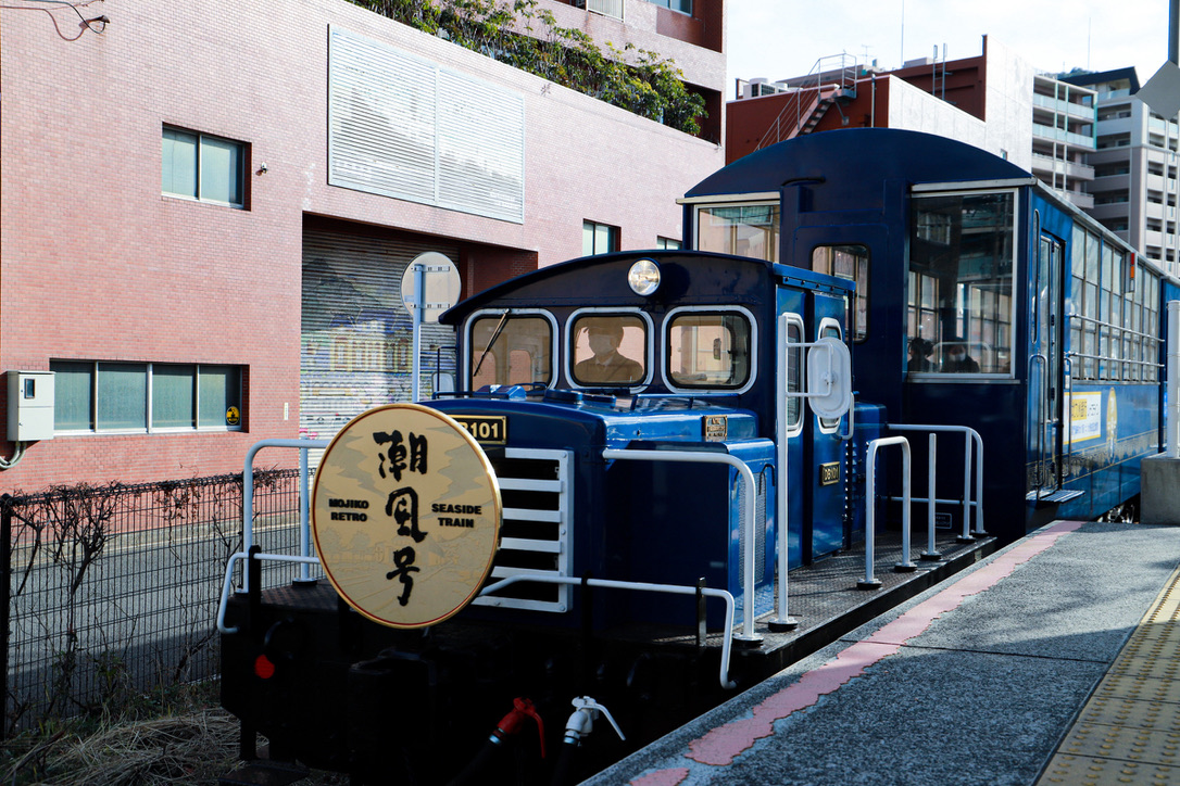 「九州鉄道記念館」を満喫したら、同館を出てすぐの場所にある「九州鉄道記念館駅」から北九州銀行レトロライン「潮風号」(通常運賃/大人片道300円・小児150円)に乗車。「関門海峡めかり駅」を目指します。