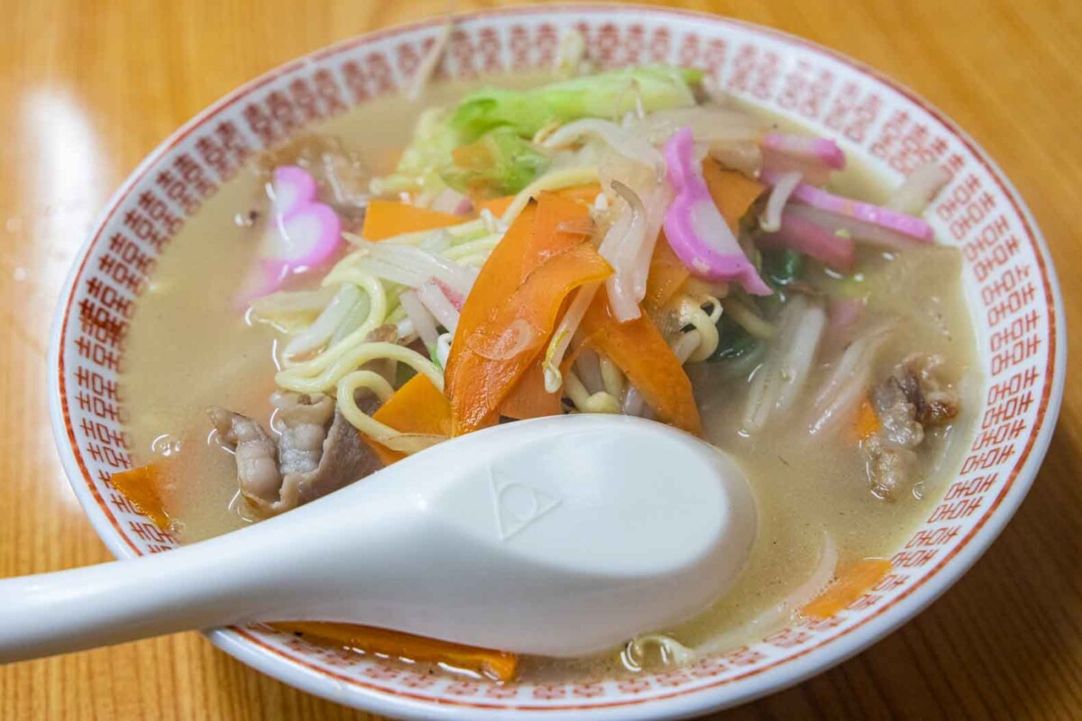 今回はちゃんぽんを注文。野菜は大きめのカットでキャベツのシャキシャキ感とニンジンの甘みが濃厚なスープと合わさり、後から油の香ばしい香りがクセになり、熱さを忘れてすすり続けてしまいます。