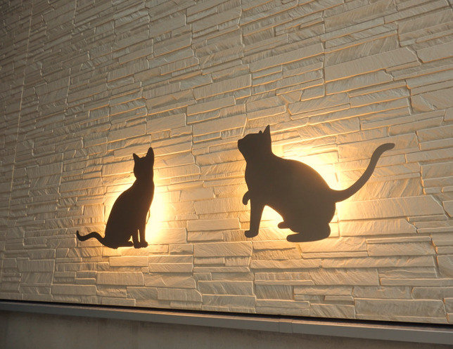 ​外壁にはネコプランを象徴する、ネコ型ウォールライトがお出迎え。部屋の中でも運動ができるように高さのあるキャットステップが設置されています。