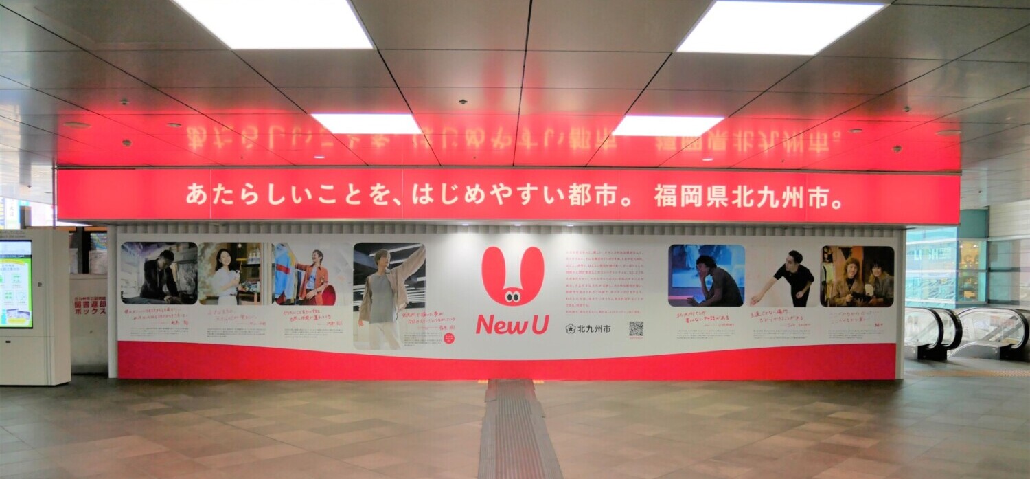 北九州市による地方創生の都市ブランド「New U(ニューユー)」大型PRボードが、JR小倉駅コンコース旧観光案内所跡(北九州市小倉北区浅野1丁目1-1)に3月16日に登場しました。