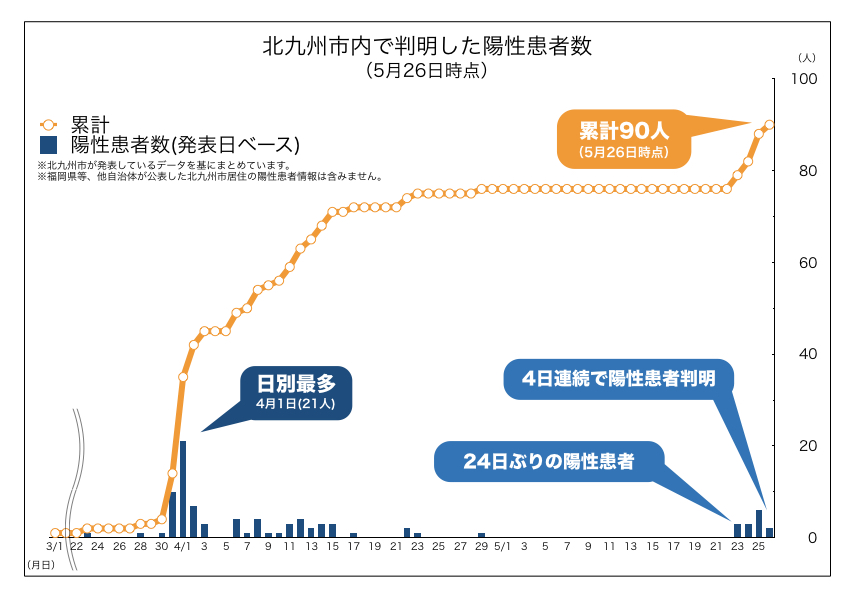 北九州市では5月26日、新型コロナウイルスの新たな陽性患者が2人見つかりました。市内で感染者が見つかるのは23日(3人)、24日(3人)、25日(6人)、26日(2人)と4日連続です。陽性患者数の累計は90人になりました。