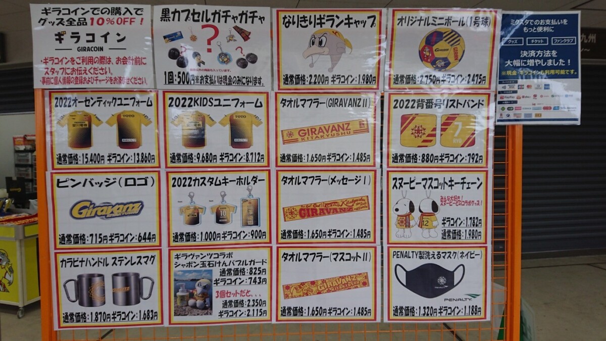 スタジアムでのお買い物する際に知っておきたいのが「ギラコイン」の存在。新規登録してチャージして使うタイプの地域通貨です。マルシェなど飲食をギラコインで利用できます。またグッズが10%オフで購入でき、お得です。