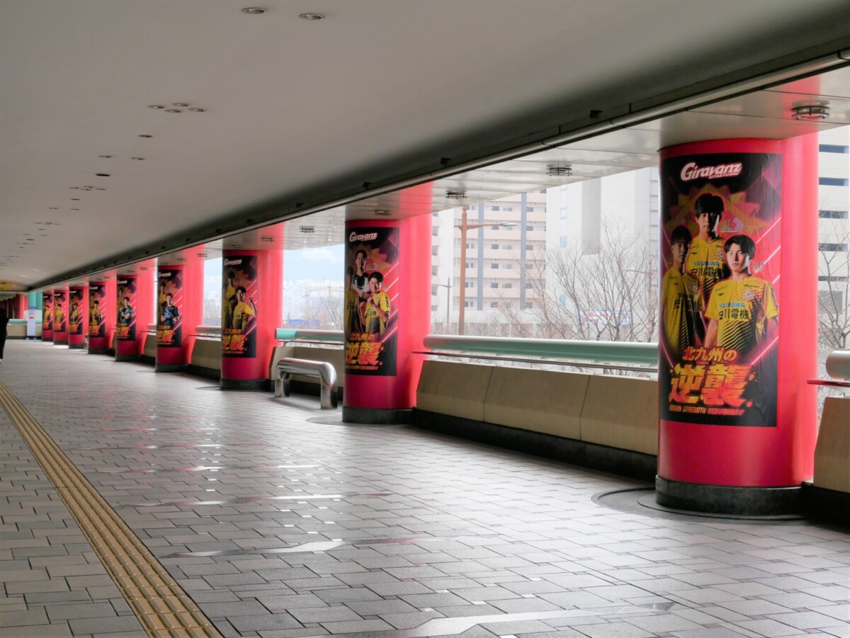 駅改札口(3F)を出て、新幹線口の方向へ。そのまま進めば見える「動く歩道」で進んでいき、リーガロイヤルホテル小倉より向こう側のAIM(アジアインポートマート)方面を目指します。右へ曲がった通路には黄や赤のチームカラー鮮やかに、ギラヴァンツの面々のポスターが柱に貼られており、誘いの道となっています。