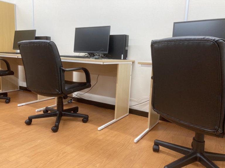 同時開設の「パソコンスクール」(写真下)は、コロナ対策のために同時受講者を6人に抑えた教室。受講者は一定時間無料でコワーキングスペースを使うことができます。パソコンスクールでは教えられたことだけでなく、パソコンを自分で調べて使いこなすことを目指しており、レッスンを受ける時間とは別にコワーキングスペースを自由に使える時間を確保することでその後押しをすると言います。