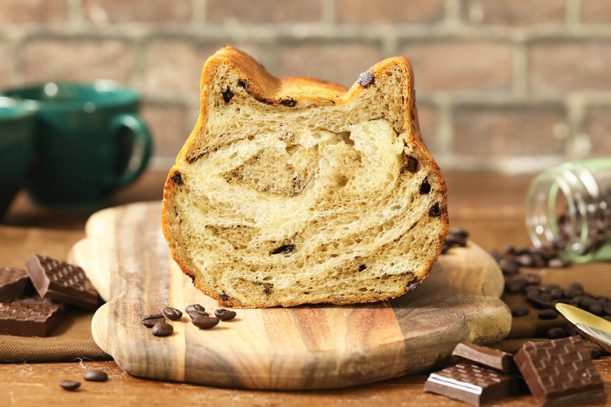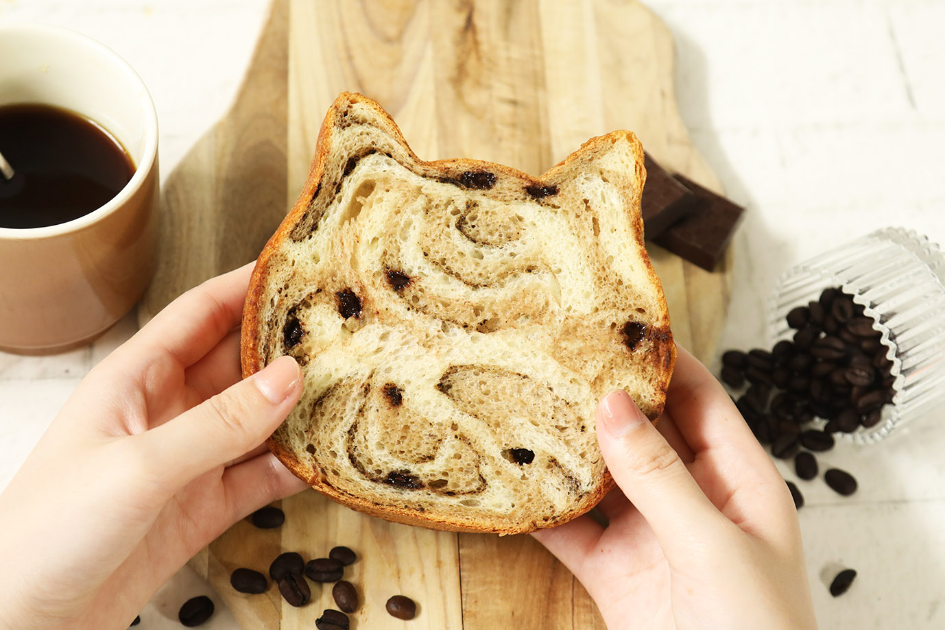 今回登場する4月限定フレーバー「ねこねこ食パン AMAZING COFFEE」は、AMAZING COFFEEを代表するブレンド豆「AMAZING BLEND」とチョコチップを混ぜたコーヒー生地、ミルク100%を使用したプレーン生地の2種類の味わいが楽しめる一品。