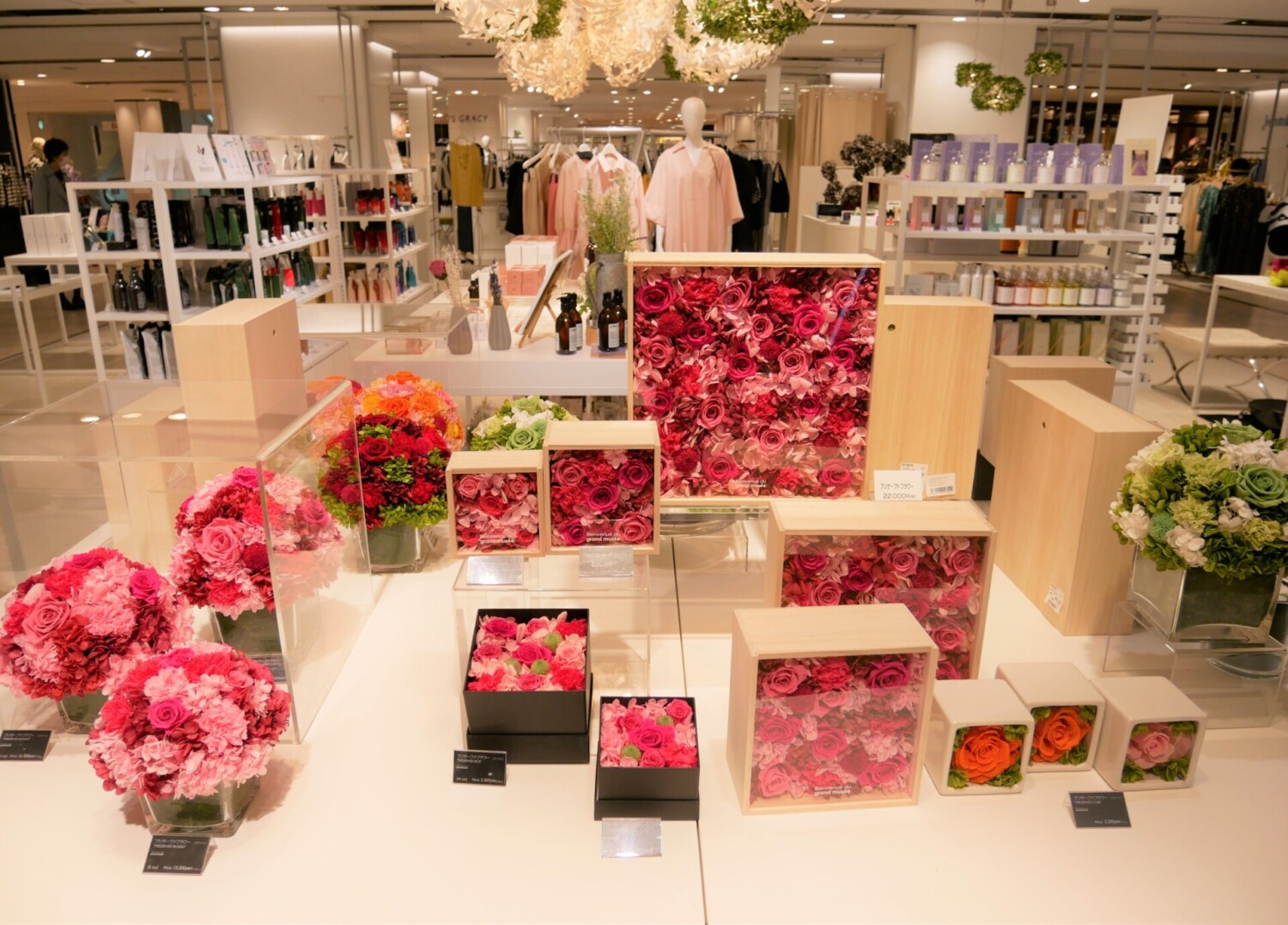 取材に訪れた日は「母の日」前ということもあって、贈り物にしたら喜ばれそうな華やかなプリザーブドフラワーがメインディスプレイになっていました。