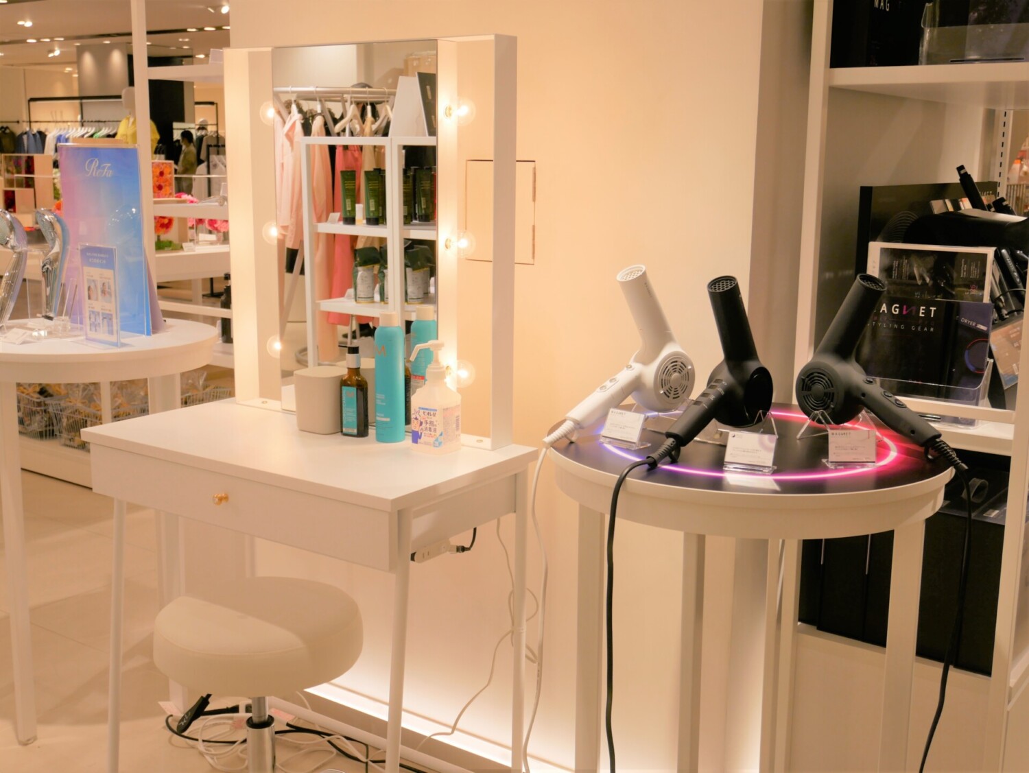 多機能ヘアドライヤーなどを実際に試せるドレッサーコーナーもあるので、落ち着いて商品を選ぶことができます。