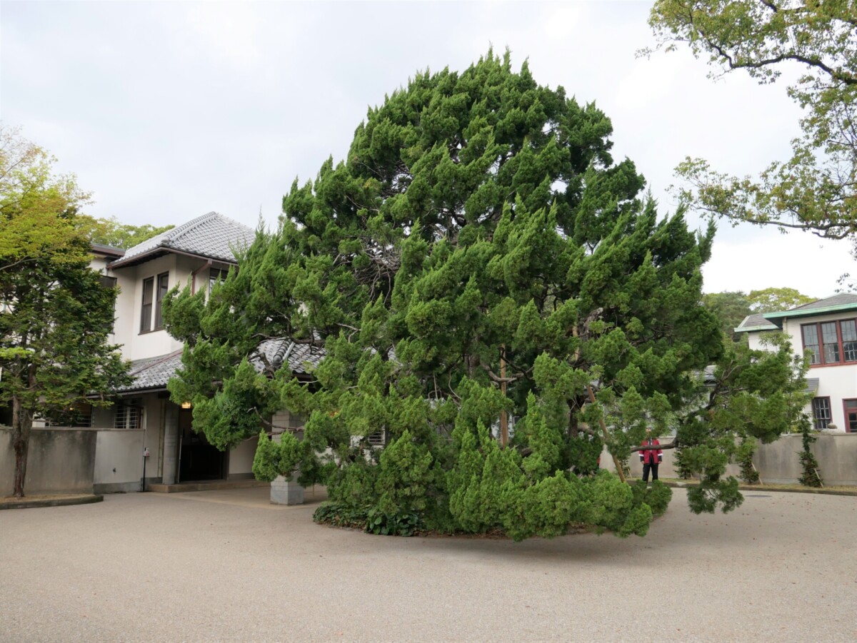 旧安川邸の正門を入って、正面にある洋風の「本館棟」(昭和13年竣工)へ。樹齢100年近いといわれる見事なカイズカイブキが出迎えてくれます。