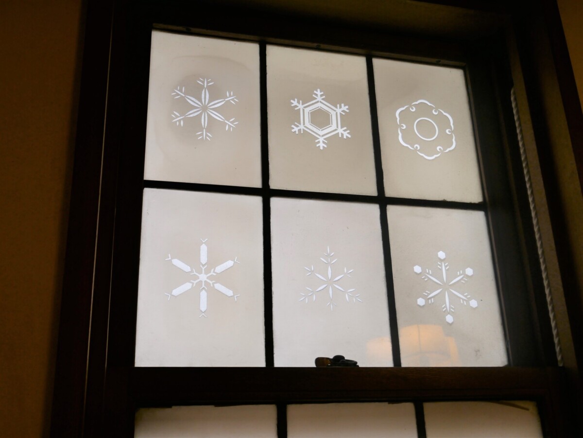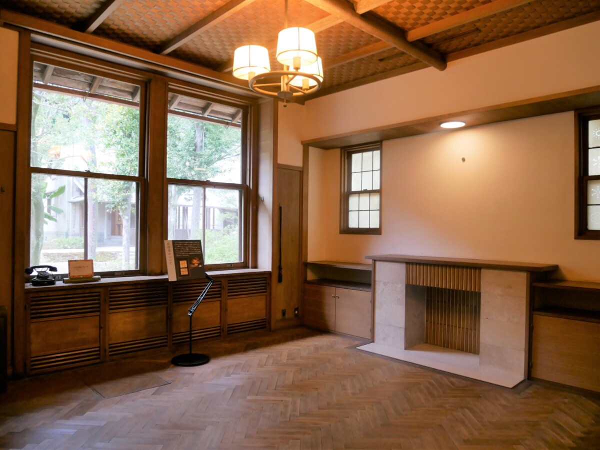 客人との面会のために建築された「応接室」は、1938(昭和13)年に洋館として建築された本館の応接室にふさわしく、暖炉やフローリング、雪の結晶がデザインされた摺りガラスの窓など、洋風の装飾が施されています。