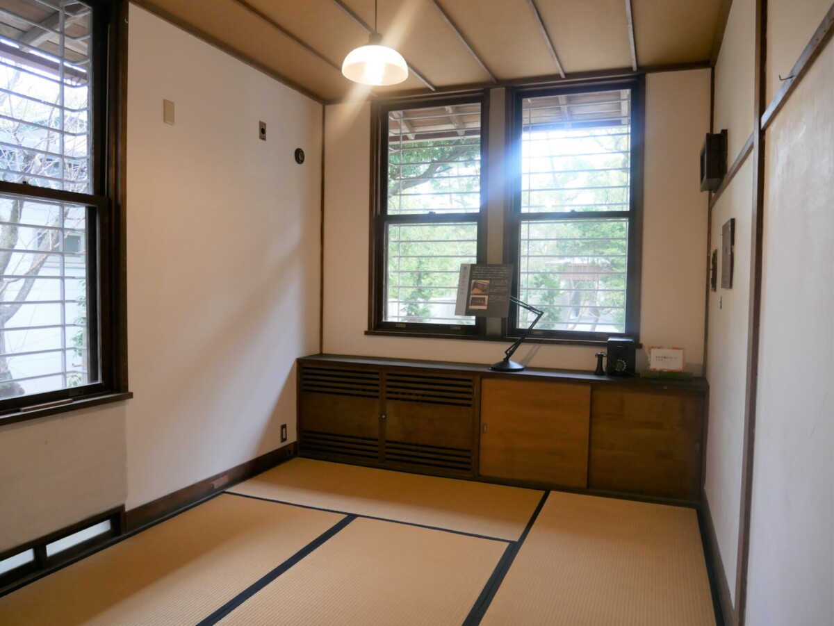 玄関を入ってすぐの場所、応接室の向かいにある「書生室」は、旧安川邸に寄宿した書生たちが過ごした部屋です。