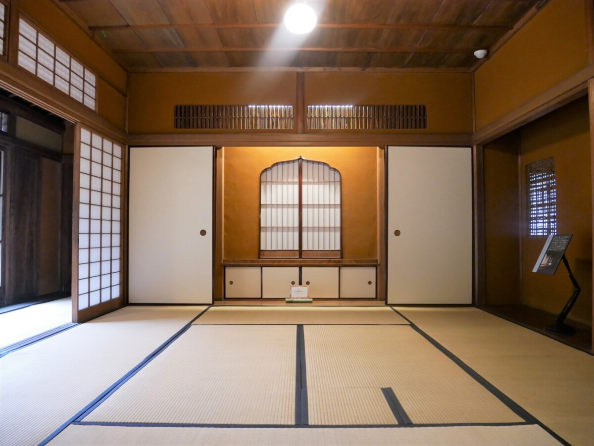 茶室内の上座には、造り付けの仏壇が配置されており、幕末から明治期に建てられた富裕層の邸宅によく見られる特徴です。