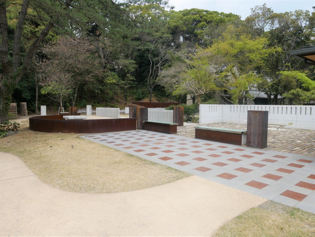 以前は時折園遊会が催されていたという南側芝生広場を整備し、生まれ変わった「鐵の記憶広場」には、激動の近代日本と安川敬一郎の思想の象徴である「鐵」をイメージし、鉄や鉄に関連する素材を配置。かつてこの場所にあったけれど現在は失われてしまった第二次本邸の建物の間取りを表現しているとのことです。