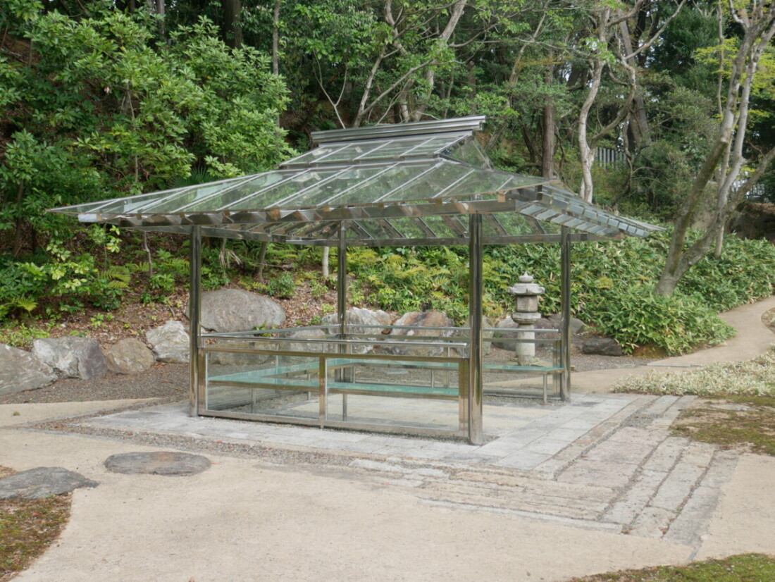 蔵から大座敷前の庭園へと向かう途中には、ガラスでできた透明な四阿(あずまや)があります。図面には謎の四角形が描かれていたものの、何があったのかは不明ということで、元々の景観を損なわないよう、風景に馴染む透明な四阿を建てたとのことです。