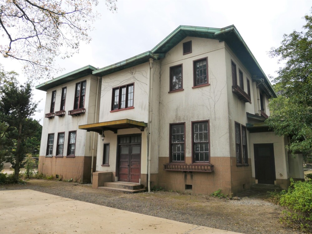 大正デザインが特徴的な「洋館棟」は昭和2年竣工。安川敬一郎が家督を譲った後、亡くなるまで住んだ場所です。テレビドラマの撮影などでも使用されたことがあるという趣ある建物ですが、耐震改修が行われていないため、現在は立ち入り禁止で外からの見学となります。