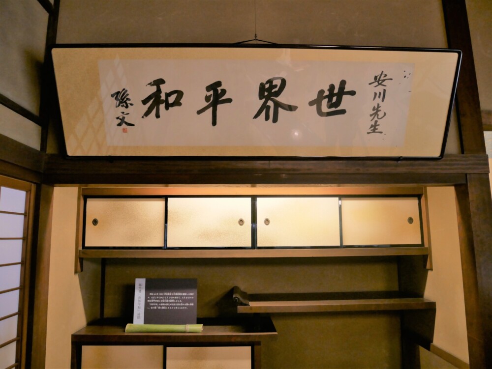 両間ともふすまや畳を取り外すと、能や狂言などの舞台に転用できる造りとなっています。大正2(1913)年には中国の革命家・孫文が訪れており、大座敷を背景に安川一族と並んで写った記念写真も残っています。また、孫文が揮毫し、安川敬一郎に贈呈した「世界平和」の扁額(レプリカ)も見ることができます。