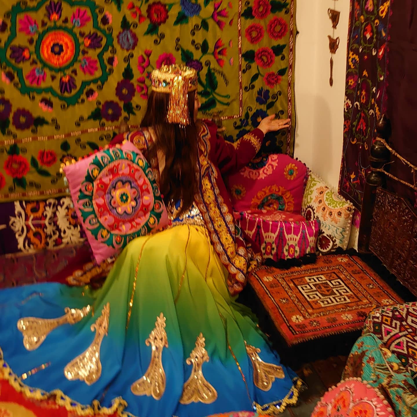 ウズベキスタンの花嫁衣装など、さまざまな種類の民族衣装が用意されており、お店でワンオーダー以上した人は、好きな衣装を着ていいというサービスが行われていました。衣装を着た後は、写真撮影も自由で、まるで旅行先のような写真を撮ることができます。男性用もあるため、多くの人が楽しむことができますね。