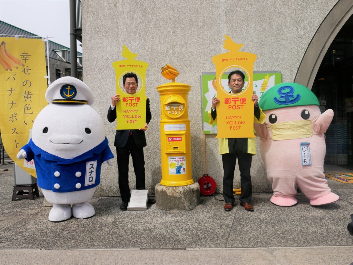 (アイキャッチ画像:「黄色いバナナのポスト」と記念撮影するマスコットキャラクタたち)