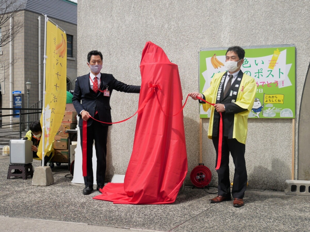 コロナ禍の影響で門司港レトロを訪れる観光客が激減した状況を受け、ポストコロナの取り組みとまちの活性化を目的に、門司区役所と地元郵便局が連携し、設置したもの。日本遺産に認定された「関門“ノスタルジック”海峡」の構成文化財の一つ「バナナの叩き売り」の発祥の地が門司港であることをPRするためのシンボル的な存在になればといいます。