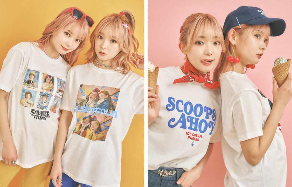 コラボアイテムは、Tシャツ(全9種)とコーデのアクセントになってくれるキャップ(全4種)。ポップでカラフルな80年代の世界観が目を引くデザインのものばかり。特にTシャツはドラマ内のシーン写真を使用したデザインから、シンプルめなロゴものまで、春コーデでヘビロテしたくなるようなラインアップとなっています。