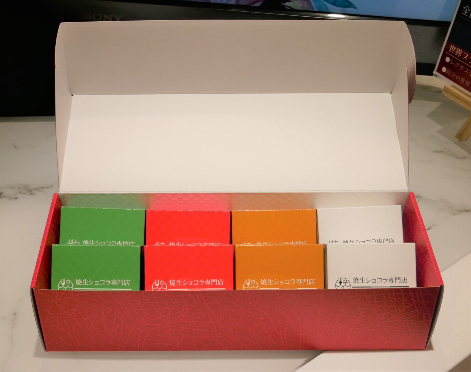 基本の8個セット(写真下、3330円)は、「焼生ショコラ」「ほうじ茶ショコラ」「酒ショコラ」(各380円)、「お抹茶ショコラ」(400円)が2個ずつセットになっています。