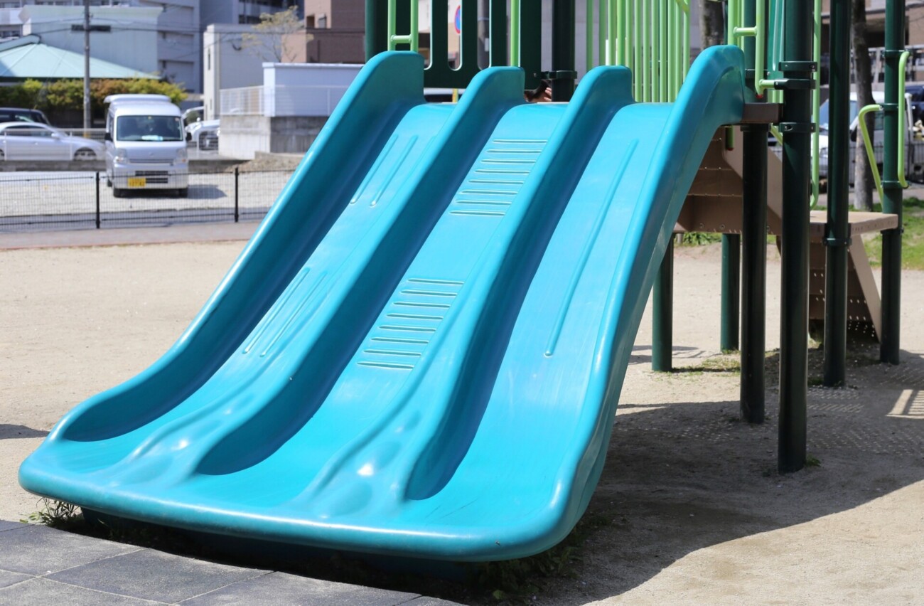 注目は、ブルー系の大きなすべり台と小さい子用のオレンジのすべり台。
