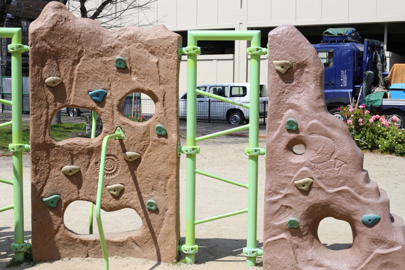 またオレンジのすべり台にはボルダリングのような遊具もついています。