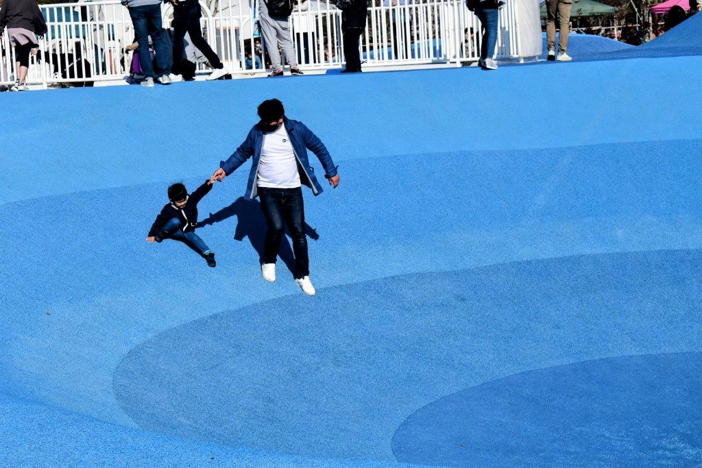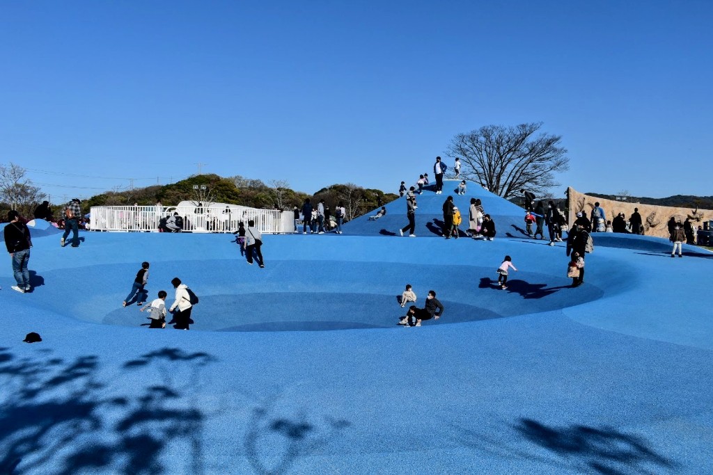 そんな世界最長ブランコの横には、眩しいくらいに真っ青な「でこぼこ広場」が。