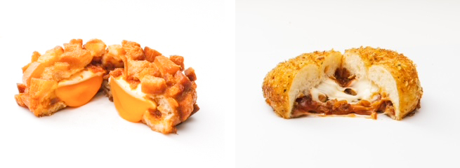 「とろ~り半熟卵カレーパン」(写真左)と「のび~るモッツァレラチーズとバジルのトマトカレーパン」(同右)