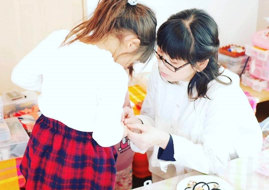 ワークショップやイベントなどで、ハンドメイド講師として活動する「子連れ出張。ありんこ。」の松原佳恵子さんは、国家資格である介護福祉士のほか、アロマアドバイザー、歯固め、アクセサリー(リボン、ビジューアクセサリー)などさまざまな資格を持ちます。