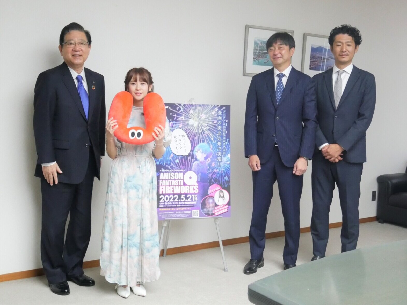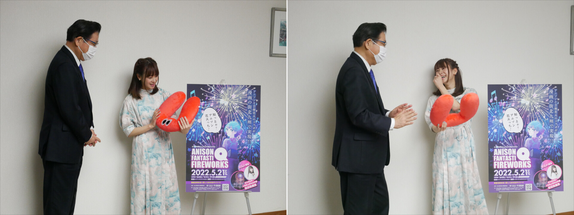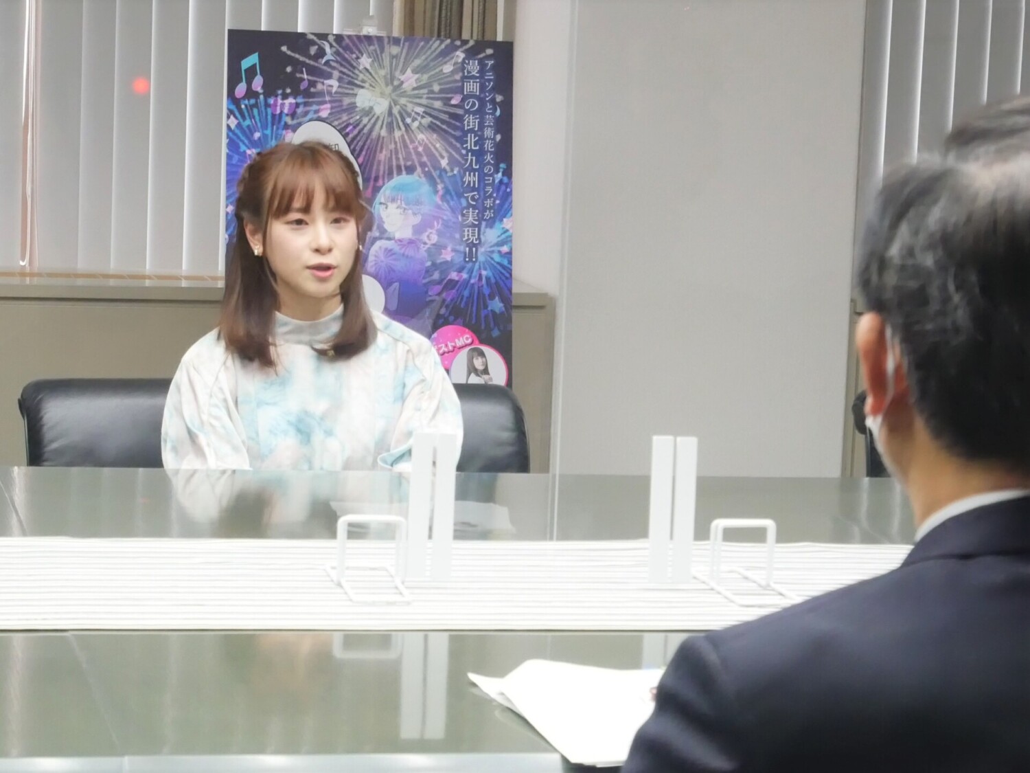 「人気のアニメ・ゲームをはじめ、テレビやラジオでも大活躍されている前田さんですが、北九州市ご出身のアーティストの方がこうやって活躍しているお姿を見ると、大変心強く嬉しく思う。多くの市民が心待ちにしている『北九州芸術花火』というビッグイベントのMCを前田さんがお務めになると聞き、大変嬉しく思っている」と北橋市長。「今回は久しぶりのご帰省とのこと。北九州は食べるものもおいしいし、住みやすい良いところなので、満喫していただいて、本市の魅力をポップカルチャー・夜景の街として発信していただきたい」と話していました。
