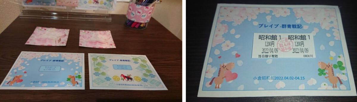 また、下記の左写真は、半券を貼り記念になるよう工夫された手作りカード。「春友」さんへの想い出作りのお手伝いがしたい、という心づかいが素敵です。筆者も貼ってみました(写真右)。チケット自体には作品名の記載がないので嬉しいです。